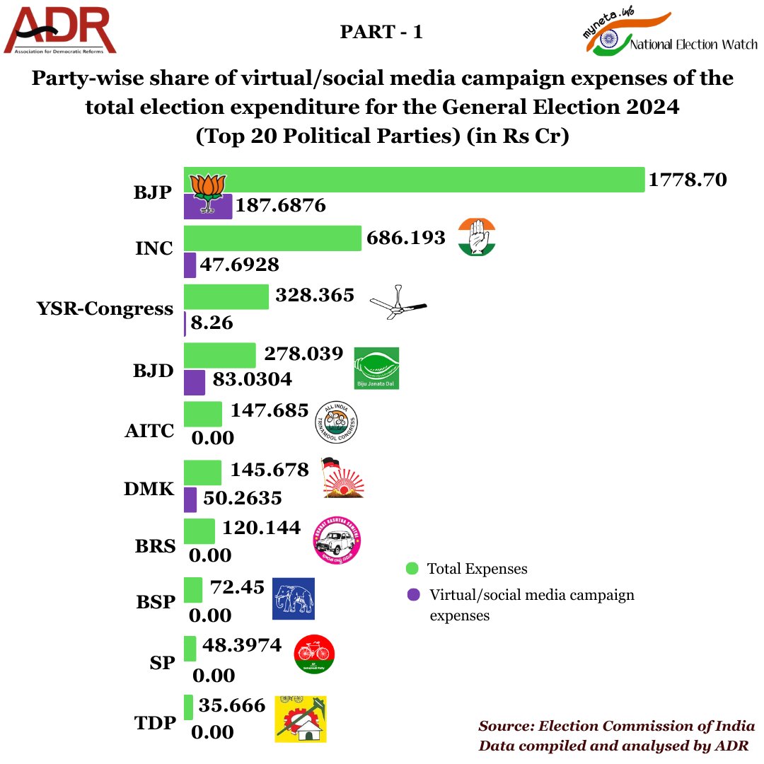 ADR noted that the figures are based on financial statements submitted by political parties to the Election Commission and reflect only the expenses reported by parties in their filings.