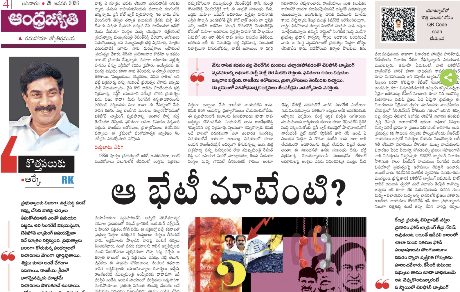 ఇది మాత్రమే కాదు.. ఈ కథనం మొత్తం తన క్రెడిట్ గురించే ఎక్కువగా చెప్పుకున్నారు. తాను కోల్ బ్లాక్ టెండర్ల గురించి బయట పెట్టడం వల్లనే దాన్ని పక్కదారి పట్టించడానికి ఫోన్ ట్యాపింగ్ కేసులో హడావుడి ప్రారంభమయిందని కూడా చెబుతున్నారు. నిజానికి ఫార్ములా ఈ రేసు కేసు, కాళేశ్వరం కేసుతో పాటు ఈ ట్యాపింగ్ కేసులో చర్యలు తీసుకోవడానికి అవసరమైన సాక్ష్యాలు అన్నీ ఉన్నాయని కానీ ప్రభుత్వమే ఆలస్యం చేస్తోందని ఆర్కే చెబుతున్నారు. ఎంత ఆలస్యమైతే కేసు అంతగా బలహీనం అవుతుందని.. వెంటనే కేసీఆర్, సంతోష్ రావులకూ నోటీసులు ఇచ్చి చర్యలు తీసుకోవాలని ఆర్కే ఈ కథనంలో పరోక్షంగా సలహా కూడా ఇచ్చారు.