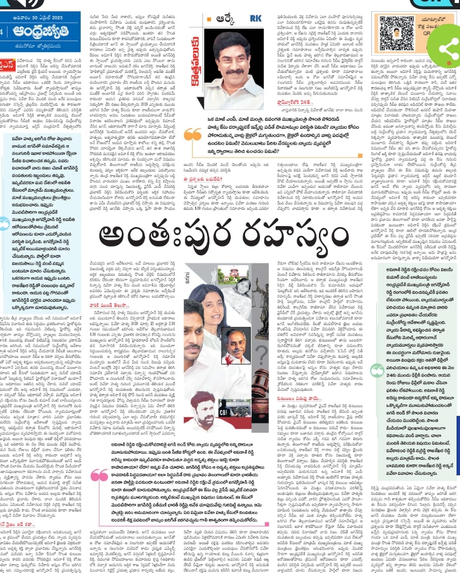 నిజంగా జగన్మోహన్ రెడ్డి అలా చెప్పి ఉంటే.. ఆ నులుగురిలో ఒకరు ఆర్కేకి చెప్పి ఉండాలి. ఉమ్మారెడ్డి వెంకటేశ్వర్లు టీడీపీ నుంచి వచ్చారు. అజేయకల్లాం కూడా సర్వీస్లో ఉన్నప్పుడు చంద్రబాబుతో సన్నిహితంగా మెలిగారు. దువ్వూరి కృష్ణ, కృష్ణమోహన్ రెడ్డి ఇద్దరూ మొదటి నుంచి జగన్ తో నే ఉన్నారు. ఈ నలుగురిలో ఎవరు ఈ విషయం ఆర్కేకు లీక్ చేసి ఉంటారన్నది కూడా ఇప్పుడు జగన్ క్యాంప్కు టెన్షన్. ఈ నలుగుర్ని సీబీఐ ప్రశ్నిస్తుందా లేదా అన్నది తర్వాత విషయం. కానీ జగన్మోహన్ రెడ్డి దంపతుల పాత్ర వివేకాహత్యలో ఉందని బలంగా నమ్మించడంలో ఆర్కే గట్టి వాదనను తన కొత్త పలుకు ద్వారా వివరించారు.