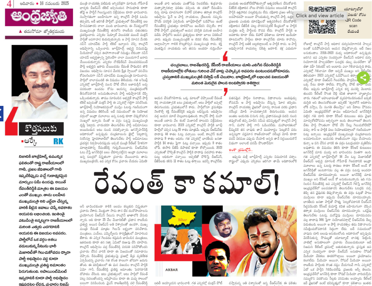 ఆంధ్రజ్యోతి ఎండీ వేమూరి రాధాకృష్ణ.. జూబ్లిహిల్స్ ఎన్నికల ఫలితంపై రేవంత్ రెడ్డిని పొగడటానికి ప్రాధాన్యమిస్తూనే ఆయనకు భవిష్యత్ దిశానిర్దేశం చేసేందుకు ఈ వారం కొత్తపలుకులో ప్రయాసపడ్డారు. చివరికి ఆయన కూడా జూబ్లిహిల్స్ పార్టీ వెనుకబడిపోయి ఉందని.. చివరికి రేవంత్ లాక్కొచ్చారని చెప్పేందుకు ప్రాధాన్యం ఇచ్చారు. కానీ ప్రజాస్వామ్యంలో ఓ నియోజకవర్గంలో లక్షల మంది ప్రజల్ని మూడు, నాలుగు రోజుల్లోమార్చలేరన్న సంగతిని మాత్రం ఆయన చెప్పలేకపోయారు.