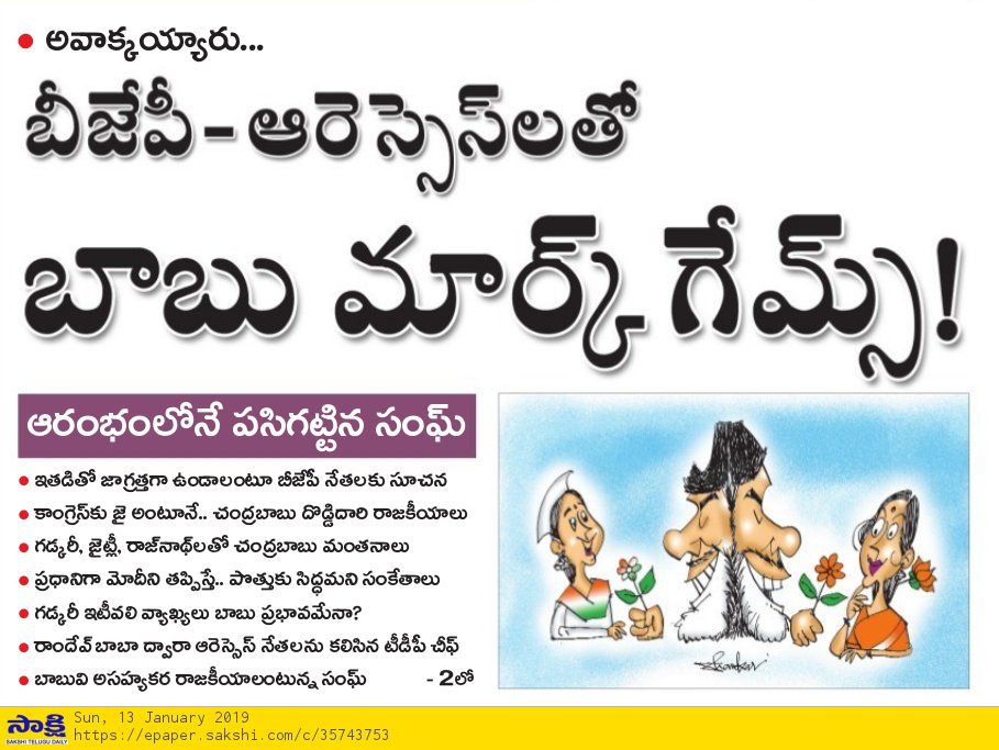 మోడీని తీసేస్తే.. మళ్లీ బీజేపీకి మద్దతిస్తామనే.. ప్రతిపాదన ఆరెస్సెస్ ముందు పెట్టారట. దానికి ఆరెస్సెస్.. చంద్రబాబుతో జాగ్రత్తగా ఉండాలని బీజేపీ నేతలకు చెప్పిందట. ఏ విషయంలో జాగ్రత్తగా ఉంటారు..? ఇప్పుడు అసలు బీజేపీతోనే… టీడీపీకి ఎలాంటి సంబంధాలు లేనప్పుడు.. బీజేపీ నేతలు ఎలా జాగ్రత్తగా ఉండాలి.. ఆరెస్సెస్ చెబుతుందో.. మరి..? అలా చెప్పినట్లయితే.. గడ్కరీకి మోడీపై తిరుగుబాటు చేసే అవకాశం ఎందుకిస్తారు..? సాక్షి పత్రిక తన యజమాని రాజకీయ ప్రయోజనాల కోసం… ఎంతకైనా దిగజారి… ఊహాగానాలు ప్రచారం చేస్తోందని… ఈ కథనం చదవిన జగన్కైనా అర్థం అయిపోతుంది. మరి సాధారణ పాఠకులకు అర్థం కాదా..?