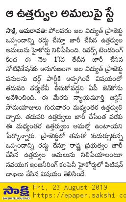 పోలవరం రివర్స్ టెండర్లను.. నిలిపి వేస్తూ.. హైకోర్టు తీర్పు ఇచ్చింది. తీర్పులో ఎన్నో కీలక వ్యాఖ్యలు చేసింది. ఒప్పందాలను.. ప్రభుత్వం ఏకపక్షంగా ఉల్లంఘిస్తూ.. రద్దు చేయడం ఏమిటని ఆశ్చర్యం వ్యక్తం చేసింది. పవర్ ప్రాజెక్ట్ విషయంలో… అసలు ఏపీ సర్కార్ ఏ అధికారంతో.. కాంట్రాక్టును టెర్మినెట్ చేసిందని ప్రశ్నించింది. ఓ రకంగా.. ఏపీ సర్కార్.. మొండి వాదనకు.. దందుడుకు నిర్ణయాలకు… హైకోర్టు తీర్పు గట్టిగానే షాక్ లా తగిలింది. దీనిపై.. తమ వాదన వినిపించుకునే అవకాశం కూడా సాక్షికి దొరకలేదు. అందుకే.. ఓ చిన్న కాలమ్ ఆర్టికల్తో సరిపెట్టారు.