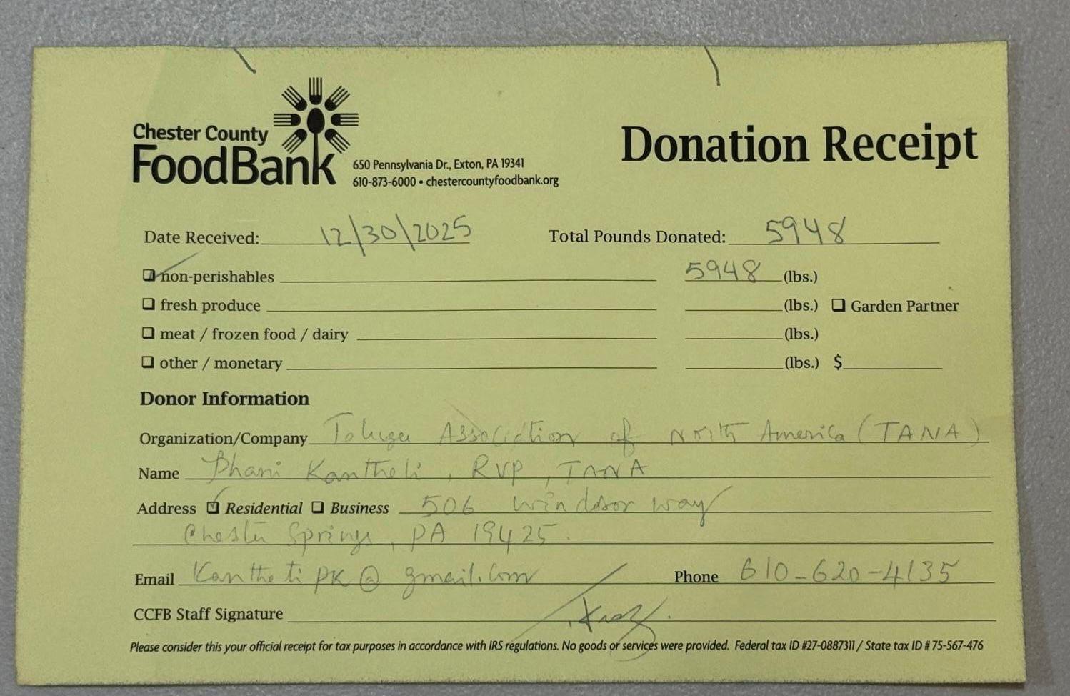 ఉత్తర అమెరికా తెలుగుసంఘం (తానా) మిడ్-అట్లాంటిక్ యువ వాలంటీర్లు ఒక అద్భుతమైన చరిత్రను సృష్టించారు. 8 వారాల పాటు ప్రాంతీయంగా నిర్వహించిన ఆహార సేకరణ కార్యక్రమంలో, 30కి పైగా పరిసర ప్రాంతాల నుండి 7,000 (3,200 కేజీలు) పౌండ్ల కంటే ఎక్కువ ఆహారాన్ని సేకరించి స్థానిక ఫుడ్ బ్యాంక్లకు విరాళంగా అందజేశారు.